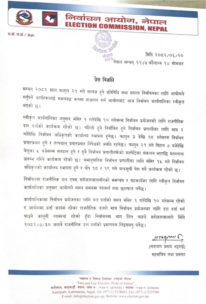 निर्वाचन आयोगका प्रवक्ता नारायणप्रसाद भट्टराईले विज्ञप्ति जारी गर्दै आयोगले गर्नुपर्ने कार्यहरूलाई समयबद्ध रूपमा सञ्चालन गर्न आयोगबाट आज निर्वाचन कार्यतालिका स्वीकृत भएको जानकारी गराएका हुन् ।