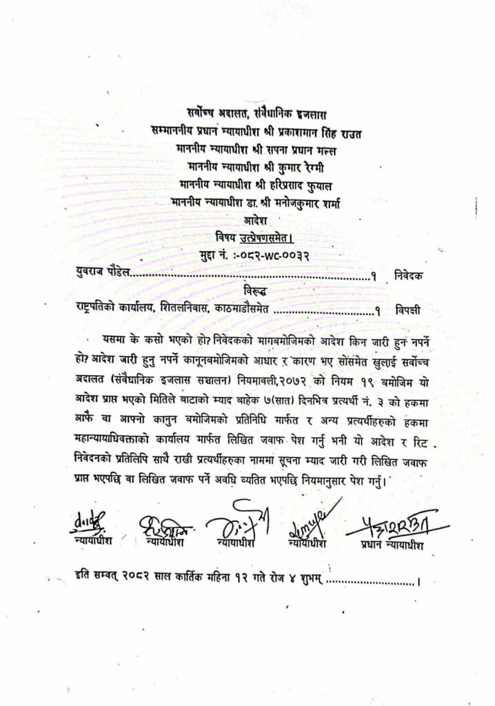 इजलासले विपक्षी राष्ट्रपति कार्यालय, प्रधानमन्त्री तथा मन्त्रिपरिषद्को कार्यालयलगायतलाई ७ दिनभित्र लिखित जवाफ पेस गर्न आदेश दिएको छ।