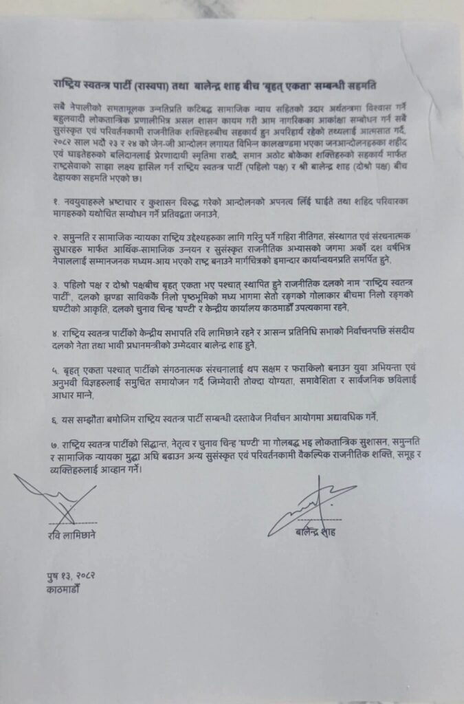 दुई नेताबीच राष्ट्रिय स्वतन्त्र पार्टीको केन्द्रीय सभापति रवि लामिछाने रहने र आसन्न प्रतिनिधिसभाको निर्वाचनपछि संसदीय दलको नेता तथा भावी प्रधानमन्त्रीको उम्मेदवार बालेन्द्र शाह हुने पनि सहमति भएको छ ।